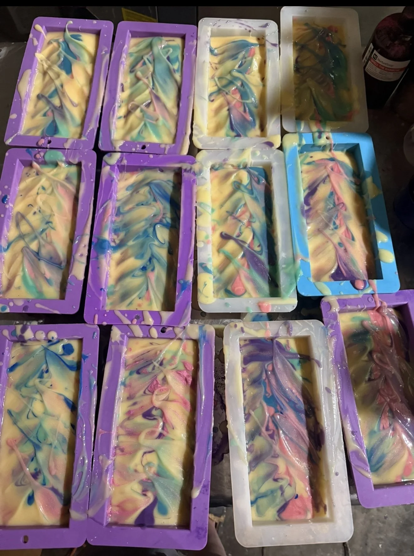 Then the scent and color is added. Then once poured in the mold a top design is created. It takes almost a day before the soap can be unmolded and cut. From there it is hurry up and wait as each bar is “cured” or dried for 6 weeks.
